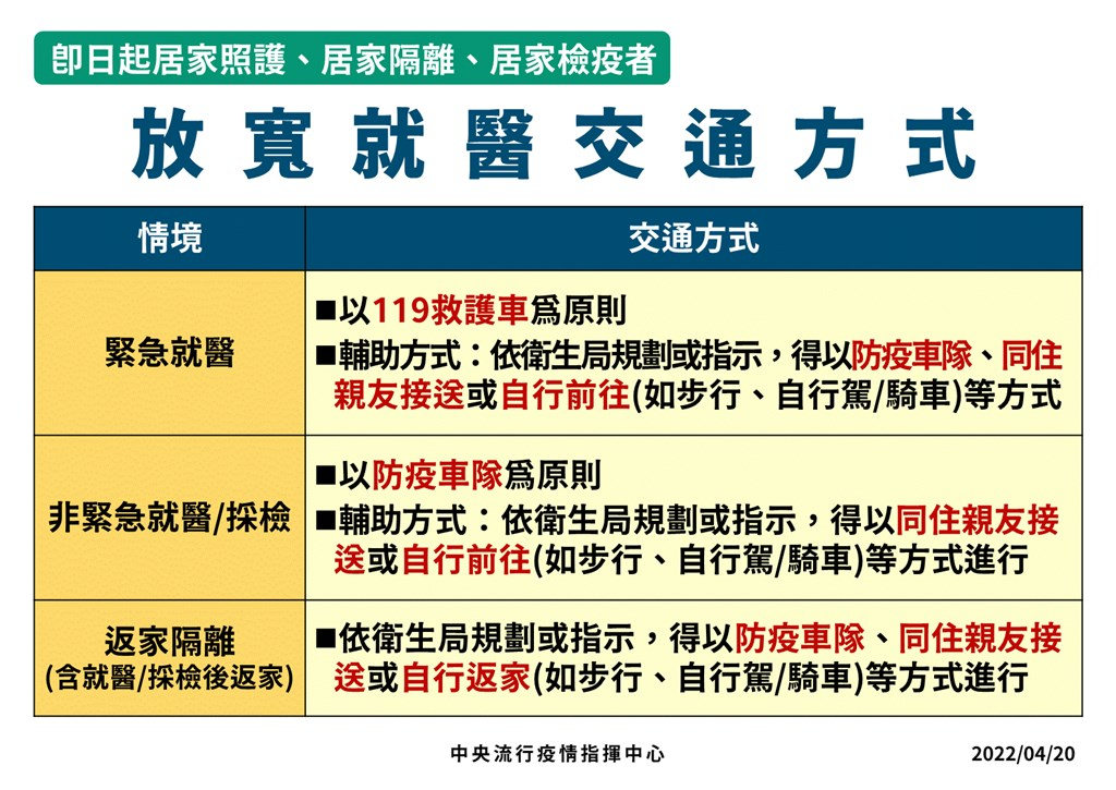 - 自主防疫:不能搭大眾交通工具含一般計程車。