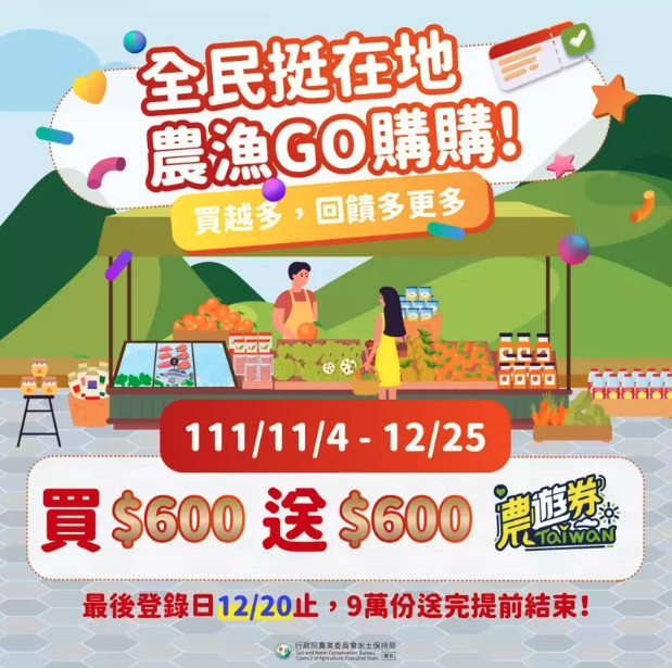 農委會在 2022 年底前再推農遊券 4.0「挺在地,農漁 GO 購購!」農遊券加碼促銷活動。即日起至 111 年 12 月 25 日止,前往指定場域購買特定農漁產品,消費滿 600 元(不含使用農遊券金額),完成農遊券 APP 發票登錄,即依登錄順序贈 600 元農遊券,限量 9 萬份喔。有關怎麼用?怎麼領取?如何登記抽籤及使用方式等 QA 叫車吧都幫你整理好了。
