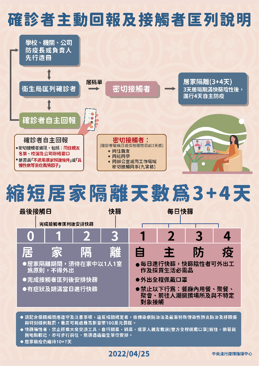 自 2022 年 4 月 25 日起,考量近期國內 COVID-19 疫情升溫,陸續發生感染源不明的病例,社區傳播可能有擴大趨勢,為兼顧實務需求及社區防疫安全,指揮中心面對疫情變化也不斷調整腳步。與確診者接觸的「居家隔離」方式,將改採「3+4」,意即3天隔離、4天自主健康管理如下: