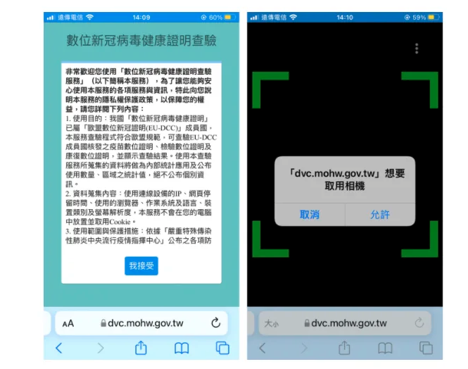 - 允許取用相機後,掃描數位新冠病毒健康證明上的QR Code,就會跳出結果,將以顏色、符號及文字區分通過與否。