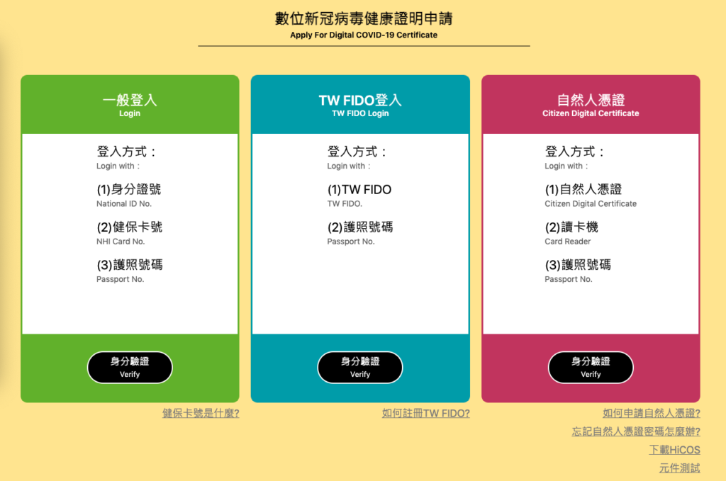 (2) FIDO(為安全且便利的生物辨識方式,提供指紋或臉部辨識登入)+有效護照號碼;(3)自然人憑證+有效護照號碼。三種方式擇一。
