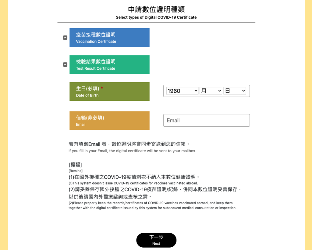身份驗證完成後,就能夠選擇「疫苗接種數位證明」或「檢驗結果數位證明」,可以同時勾選兩個,務必填寫生日,才能點選「下一步」。