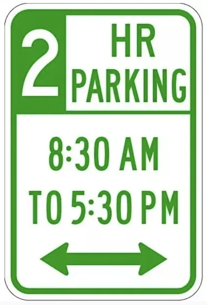- 限定時段的停車標示:下圖為每天早上 8:30 到下午 5:30 可以停車,但該時段內每次最多只能停 2 小時。若在這個時區間之外,就無停車 2 小時的限制。但看到這個標誌不等於免費,若是停車格旁邊有停車收費錶 Meter,則是收費停車格。下方的雙箭頭則是指以此標誌牌為基準,它的左右兩側都可以停車。