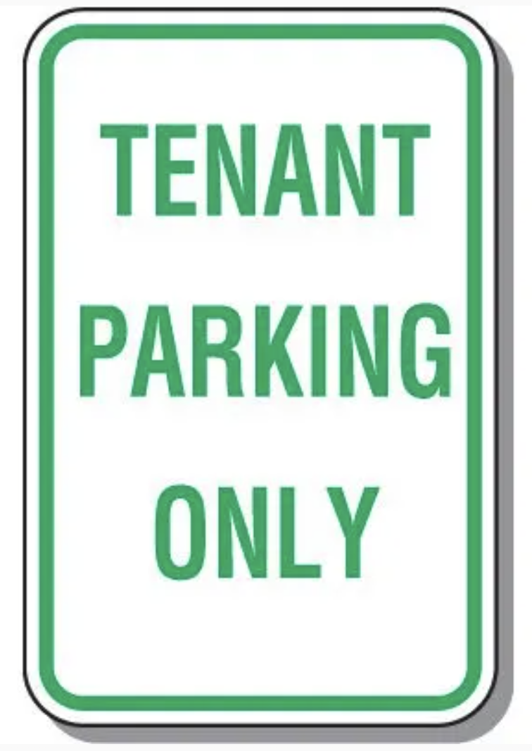 - 租戶專屬停車位(Reserved Parking Only):租戶專屬停車位,如字面意義,僅給租戶使用,一般會將租戶的證明文件(permit)擺在擋風玻璃前,供他人辨識該車輛是否為租戶所有。若忘記擺放,則有可能讓車輛有被拖吊的風險。