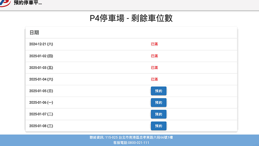 ③ 頁面會顯示可預約的日期,選好日期後點擊預約,接著依序填寫姓名、停車天數及車牌等資料並送出,即預約完成。