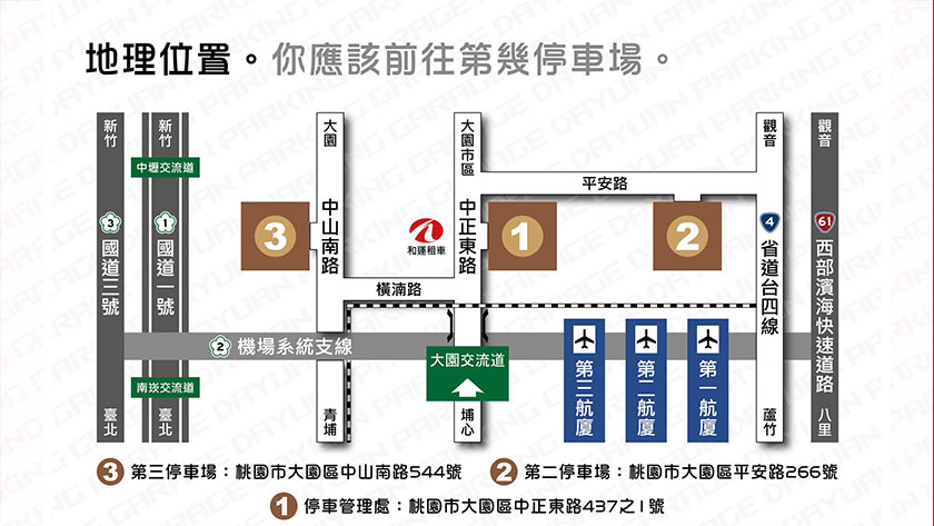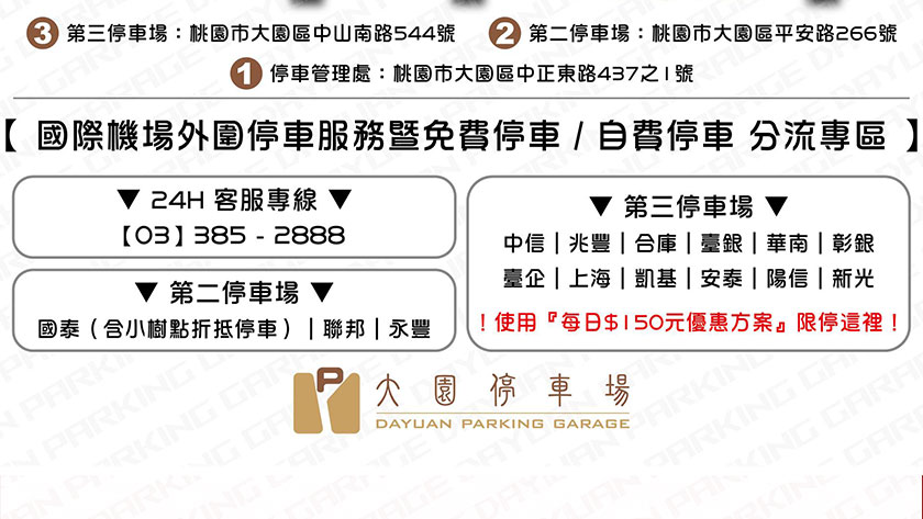 - 第三停車場:桃園市大園區中山南路 480 號(距桃機 T2 出境口約 9 分鐘車程)