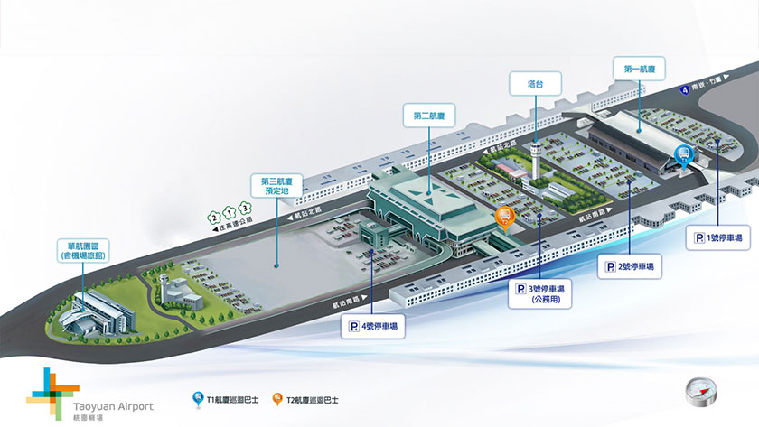 - 停車場管理處:桃園市大園區中正東路 437-1 號(距桃機 T1 出境口約 9 分鐘車程)