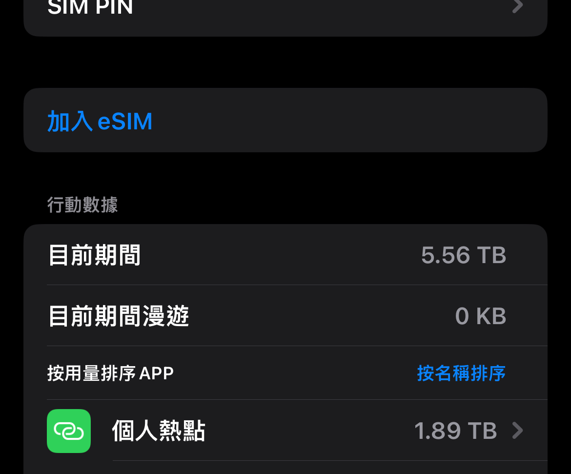 - iPhone:前往「設定」→ 進入「行動服務」下拉,可看到「目前期間」顯示在某段時間內累積的「行動網路用量」。