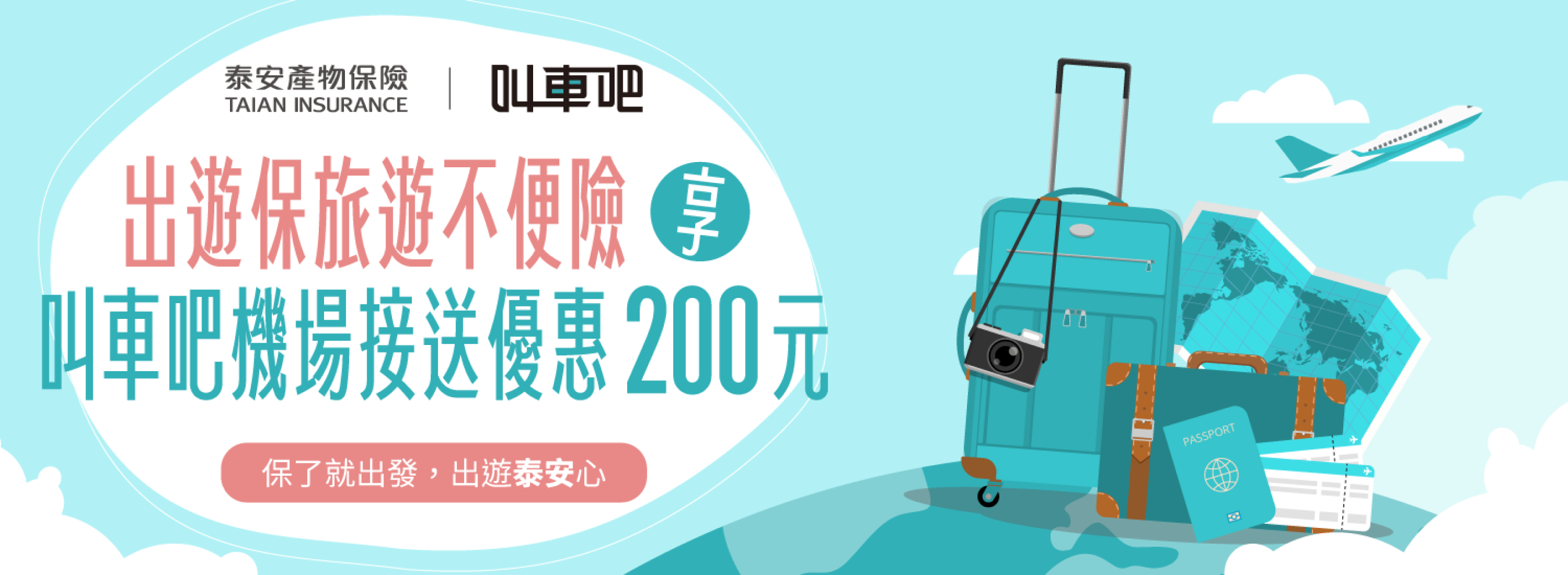 - 活動內容:透過指定連結投保泰安旅行平安險或旅行綜合保險後,即可在電子保單通知信中獲得優惠序號。預約叫車吧的機場接送服務時,輸入優惠碼【TAIANCCB200】,立享 200 元折價優惠!