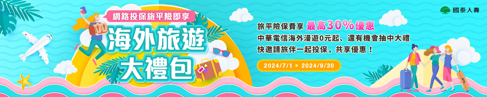 - 活動內容:活動期間內網路投保國泰人壽海外旅平險即享「海外旅遊大禮包」五重好禮!