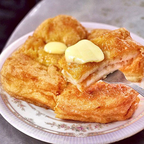 香港人吃粥時常常會配「炸兩」,這是把腸粉和油條結合的小吃。炸兩裡的油條不是脆口的,而是比較紮實,咬起來更像炸麵包。如果又想吃腸粉又想吃油條,那炸兩就是絕佳選擇!特別是淋上麻醬和甜醬,那種獨特的口味在台灣可不常見。
