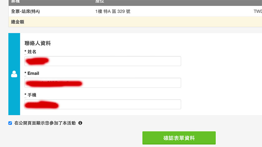 送出座位和票數後,系統會跳出聯絡人資料確認。如果系統沒自動幫你填寫,那就需要自己輸入。建議大家在搶票前可以先準備好重要的聯絡資料,像是姓名、身分證字號、手機號碼、Email 信箱,這樣之後就能直接複製貼上,超快速搞定!