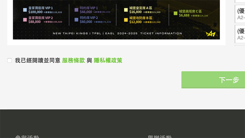 選好位置和票數後,記得要勾選「我已經閱讀並同意服務條款與隱私權政策」,這樣才能順利進入下一步。如果沒勾選,不管怎麼按,頁面都不會有反應哦!