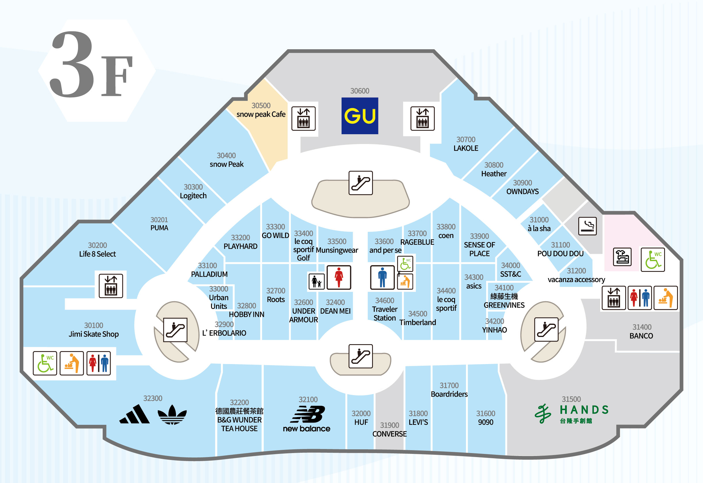 - 3 樓(3F):LAKOLE、à la sha、9090、Levi’s、Roots、RAGEBLUE、coen、SENSE OF PLACE、SST&C、yinhao、Timberland、PUMA、New Balance、adidas、UNDER ARMOUR、PALLADIUM、ASICS、vacanza accessory ⋯⋯。