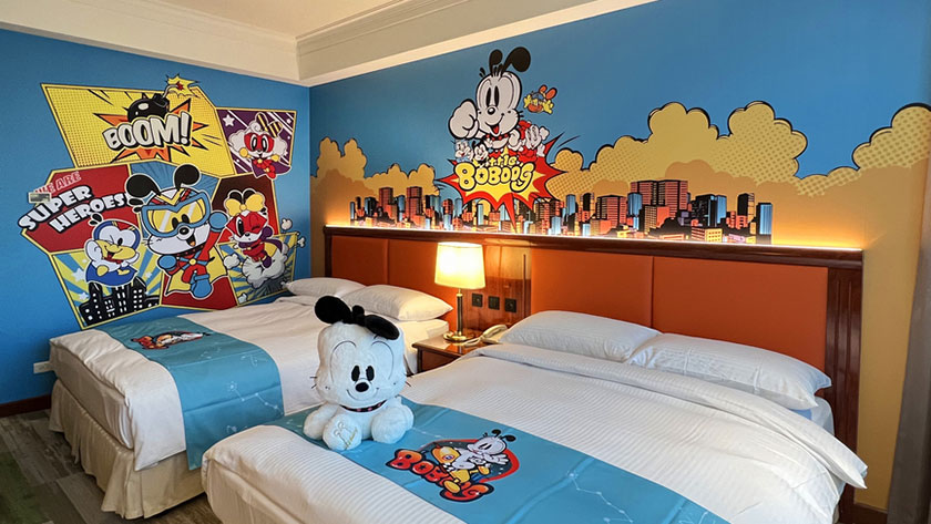 台中長榮桂冠酒店攜手日本人氣角色「巴布豆 BOB DOG」,打造全台唯一主題樓層,推出 17 間風格各異的主題房,涵蓋宇宙、衝浪、英雄等趣味主題,房內佈滿可愛角色與療癒玩偶。活動至 2025 年底止,入住即可享價值約 3,500 元的四重好禮、自助早餐,並可與一樓巨型巴布豆氣偶合影留念。飯店更規劃多項寓教於樂的親子活動,包括海底主題的創意料理課程、結合數學概念的遊戲、大型積木創作挑戰,以及夜間帳篷內的親子繪本共讀,豐富孩子的感官與情感體驗。設施方面,設有免費桌球場與藏書豐富的兒童閱讀區,動靜皆宜。飯店每日徹底清潔玩具區,確保孩童在安全、衛生的環境中盡情玩樂。