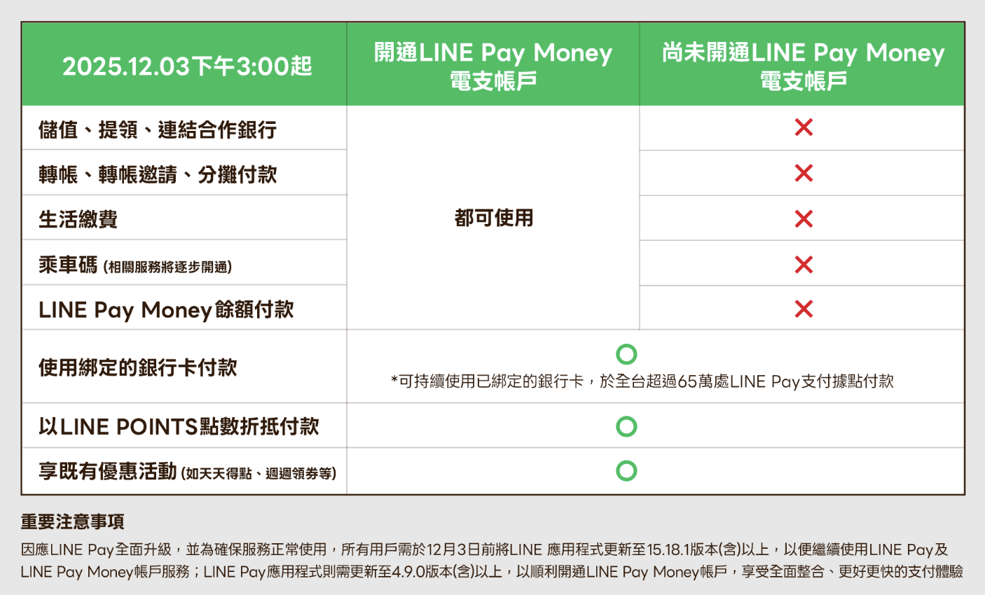 ❌ 無法使用 LINE POINTS 折抵消費 ❌ 無法透過獲得 LINE POINTS 回饋 |