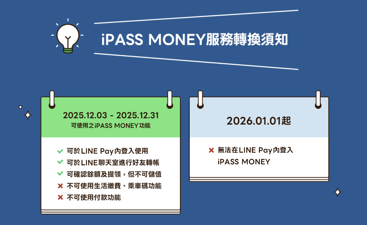 LINE Pay 將在 2025 / 12 / 3 升級成全新的「LINE Pay Money」,原本在 LINE 內使用的 iPASS MONEY 也將正式退出。如果你在擔心「那我原本 iPASS 的錢怎麼辦?」、「好友轉帳功能還能用嗎?」,這篇文章會用最簡單的方式告訴你:iPASS MONEY 的功能未來要到哪裡用、LINE Pay Money 會提供哪些新功能,讓你輕鬆完成轉換,不漏掉任何重要步驟。