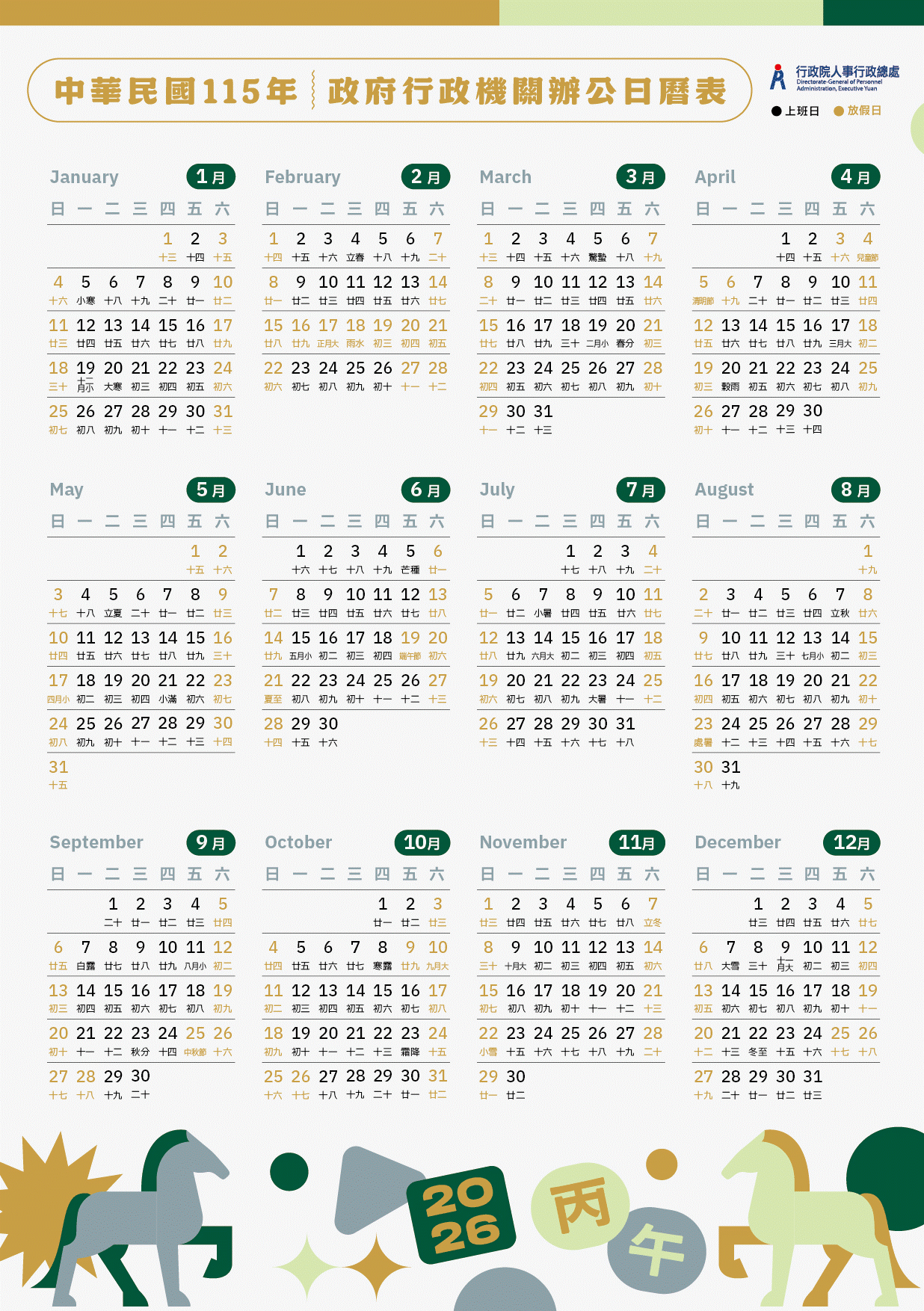 行政院人事行政總處已公布 2026 整年度假期行事曆。除每週六、日的固定休假日外,2026 另有多個國定紀念日依法放假。以下為 2026 放假國定紀念日一覽: